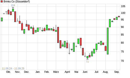 Mit dem Anstieg auf 97,50 EUR hat die BRINKS CO-Aktie (ISIN US1096961040) am 10.09.2025 ein neues 6-Monats-Hoch erreicht und damit den Kurs vom 05.09.2025 eingestellt.Die BRINKS CO-Aktie befindet ...weiterlesen