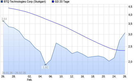 Mit dem Anstieg auf 2,80 EUR hat die BTQ Technologies-Aktie am 25.02.2026 die 20-Tage-Linie nach oben gekreuzt.Die BTQ Technologies-Aktie befindet sich seit dem 21.01.2026 im ...weiterlesen
