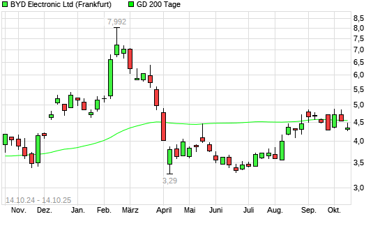 Mit dem Rücksetzer auf 4,47 EUR hat die BYD Electronic-Aktie am 13.10.2025 die 200-Tage-Linie nach unten gekreuzt.Die BYD Electronic-Aktie befand sich seit dem 02.10.2025 ...weiterlesen