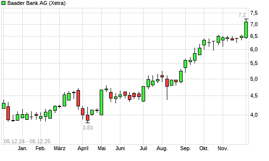 Mit dem Anstieg auf 7,00 EUR hat die Baader Bank-Aktie (ISIN DE0005088108) am 04.12.2025 ein neues 3-Jahres-Hoch erreicht und damit den Kurs vom 03.12.2025 eingestellt.Die Baader Bank-Aktie ...weiterlesen