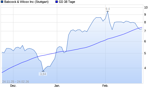Mit dem Rücksetzer auf 6,95 EUR hat die Babcock & Wilcox-Aktie am 23.02.2026 die 38-Tage-Linie nach unten gekreuzt.Der Abstand zur 200-Tage-Linie beträgt aktuell ...weiterlesen