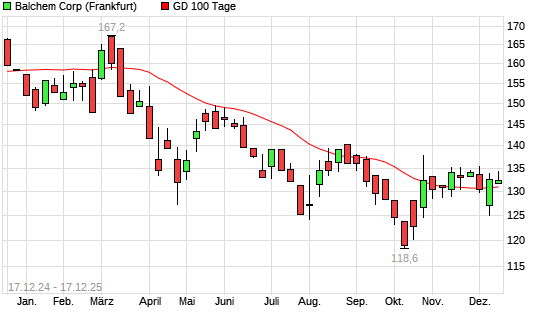 Mit dem Anstieg auf 132,50 EUR hat die Balchem-Aktie am 16.12.2025 die 100-Tage-Linie nach oben gekreuzt.Die Balchem-Aktie befindet sich seit dem 11.03.2025 im langfristigen Abwärtstrend und ...weiterlesen