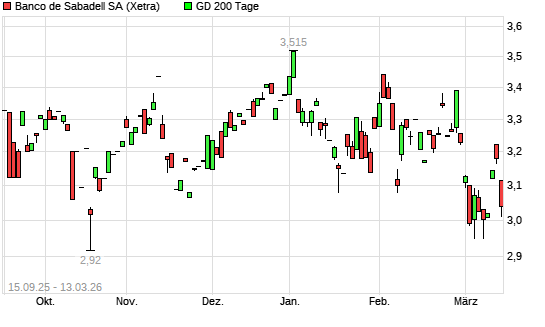 Mit dem Rücksetzer auf 3,01 EUR hat die Banco Sabadell-Aktie am 12.03.2026 die 200-Tage-Linie nach unten gekreuzt.Die Banco Sabadell-Aktie befand sich seit dem 11.03.2026 ...weiterlesen
