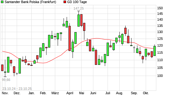 Mit dem Anstieg auf 120,55 EUR hat die Bank Zachodni-Aktie am 22.10.2025 die 100-Tage-Linie nach oben gekreuzt.Die Bank Zachodni-Aktie befindet sich seit dem 29.08.2025 im langfristigen Abwärtstrend ...weiterlesen