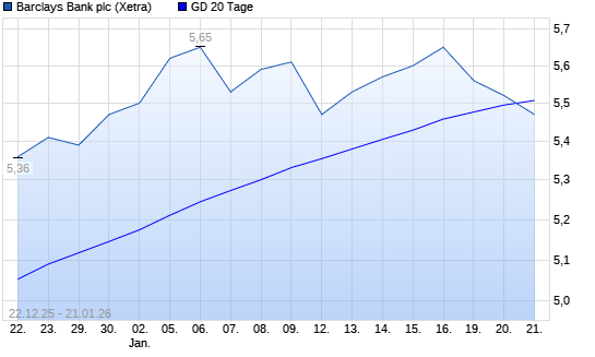 Mit dem Rücksetzer auf 5,47 EUR hat die Barclays Bank-Aktie am 20.01.2026 die 20-Tage-Linie nach unten gekreuzt.Die Barclays Bank-Aktie befindet sich seit dem 14.04.2025 ...weiterlesen