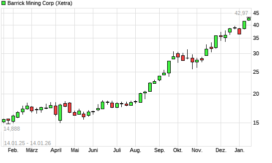 Mit dem Anstieg auf 42,96 EUR hat die Barrick Gold-Aktie (ISIN CA06849F1080) am 13.01.2026 ein neues All-Time-High erreicht und damit den Kurs vom 12.01.2026 eingestellt.Die Barrick Gold-Aktie ...weiterlesen