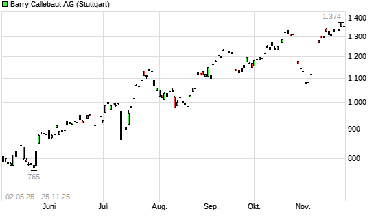Mit dem Anstieg auf 1.380,00 EUR hat die Barry Callebaut-Aktie (ISIN CH0009002962) am 24.11.2025 ein neues 6-Monats-Hoch erreicht und damit den Kurs vom 21.11.2025 eingestellt.Die Barry Callebaut-Aktie ...weiterlesen