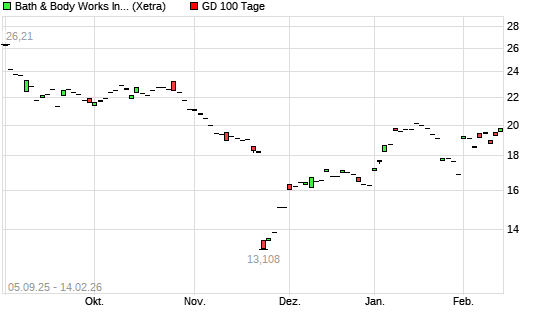 Mit dem Anstieg auf 19,08 EUR hat die Bath & Body Works-Aktie am 13.02.2026 die 100-Tage-Linie nach oben gekreuzt.Die Bath & Body Works-Aktie befindet sich seit dem 04.03.2025 ...weiterlesen