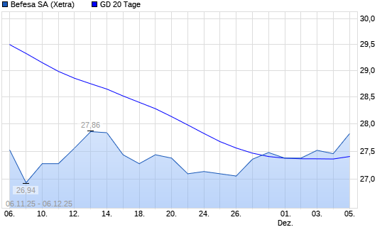 Mit dem Anstieg auf 27,42 EUR hat die Befesa-Aktie am 05.12.2025 die 20-Tage-Linie nach oben gekreuzt.Die Befesa-Aktie befindet sich seit dem 02.12.2025 im langfristigen Aufwärtstrend und hat ...weiterlesen