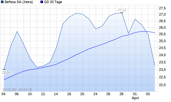 Mit dem Rücksetzer auf 25,86 EUR hat die Befesa-Aktie am 03.04.2025 die 20-Tage-Linie nach unten gekreuzt.Die Befesa-Aktie befindet sich seit dem 14.03.2025 im ...weiterlesen