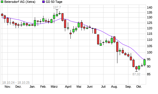 Mit dem Anstieg auf 95,22 EUR hat die Beiersdorf-Aktie am 17.10.2025 die 50-Tage-Linie nach oben gekreuzt.Die Beiersdorf-Aktie befindet sich seit dem 06.05.2025 im langfristigen Abwärtstrend ...weiterlesen
