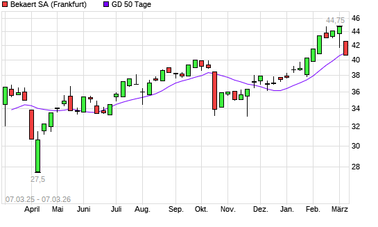 Mit dem Rücksetzer auf 40,70 EUR hat die Bekaert-Aktie am 06.03.2026 die 50-Tage-Linie nach unten gekreuzt.Die Bekaert-Aktie befindet sich seit dem 21.11.2025 im ...weiterlesen