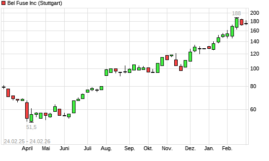 Mit dem Anstieg auf 191,00 EUR hat die Bel Fuse-Aktie (ISIN US0773472016) am 23.02.2026 ein neues All-Time-High erreicht und damit den Kurs vom 13.02.2026 eingestellt.Die Bel ...weiterlesen