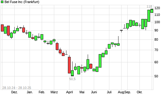 Mit dem Anstieg auf 118,00 EUR hat die Bel Fuse-Aktie (ISIN US0773472016) am 27.10.2025 ein neues All-Time-High erreicht und damit den Kurs vom 24.10.2025 eingestellt.Die Bel Fuse-Aktie befindet ...weiterlesen