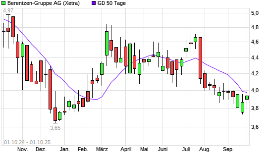 Mit dem Anstieg auf 4,00 EUR hat die Berentzen-Aktie am 30.09.2025 die 50-Tage-Linie nach oben gekreuzt.Die Berentzen-Aktie befindet sich seit dem 29.07.2025 im langfristigen Abwärtstrend und ...weiterlesen