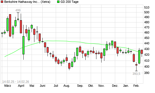 Mit dem Rücksetzer auf 421,10 EUR hat die Berkshire Hathaway B-Aktie am 13.02.2026 die 200-Tage-Linie nach unten gekreuzt.Die Berkshire Hathaway B-Aktie befand sich seit dem 12.02.2026 ...weiterlesen