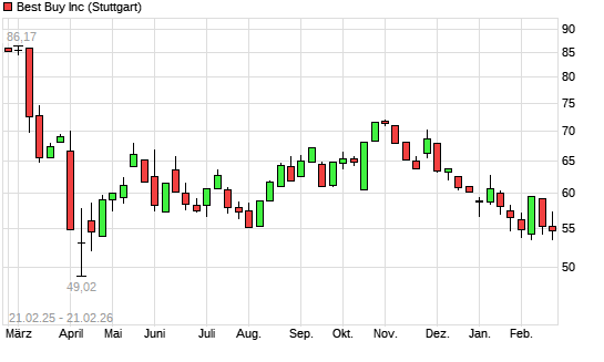 Mit dem Rücksetzer auf 53,88 EUR hat die Best Buy-Aktie (ISIN US0865161014) am 20.02.2026 ein neues 6-Monats-Tief erreicht und damit den Kurs vom 29.01.2026 eingestellt.Die ...weiterlesen