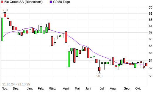 Mit dem Anstieg auf 53,30 EUR hat die Bic-Aktie am 20.10.2025 die 50-Tage-Linie nach oben gekreuzt.Die Bic-Aktie befindet sich seit dem 03.04.2025 im langfristigen Abwärtstrend und hat in diesem ...weiterlesen