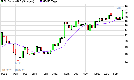 Mit dem Rücksetzer auf 29,58 EUR hat die BioArctic AB B-Aktie am 17.02.2026 die 50-Tage-Linie nach unten gekreuzt.Der Abstand zur 200-Tage-Linie beträgt aktuell +22,93%. ...weiterlesen
