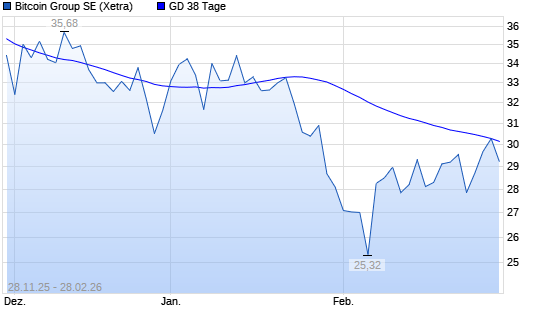 Mit dem Anstieg auf 30,36 EUR hat die Bitcoin Group-Aktie am 27.02.2026 die 38-Tage-Linie nach oben gekreuzt.Die Bitcoin Group-Aktie befindet sich seit dem 10.10.2025 im ...weiterlesen