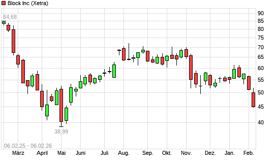 Mit dem Rücksetzer auf 45,26 EUR hat die Block (ex Square)-Aktie (ISIN US8522341036) am 05.02.2026 ein neues 6-Monats-Tief erreicht und damit den Kurs vom 03.02.2026 eingestellt.Die Block ...weiterlesen