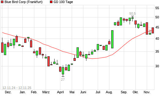 Mit dem Rücksetzer auf 43,20 EUR hat die Blue Bird-Aktie am 11.11.2025 die 100-Tage-Linie nach unten gekreuzt.Die Blue Bird-Aktie befindet sich seit dem 02.07.2025 im langfristigen Aufwärtstrend ...weiterlesen