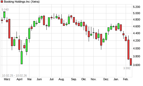 Mit dem Rücksetzer auf 3.593,00 EUR hat die Booking Holdings-Aktie (ISIN US09857L1089) am 09.02.2026 ein neues 12-Monats-Tief erreicht und damit den Kurs vom 06.02.2026 eingestellt.Die ...weiterlesen