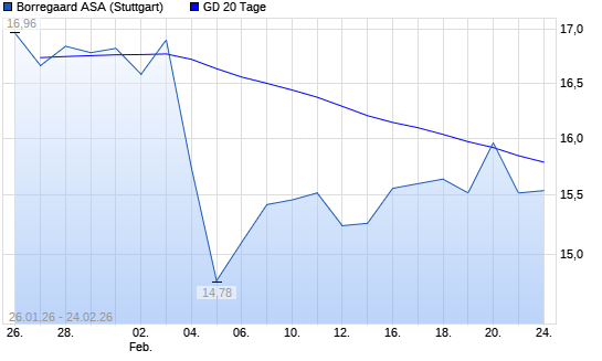 Mit dem Rücksetzer auf 15,52 EUR hat die Borregaard-Aktie am 23.02.2026 die 20-Tage-Linie nach unten gekreuzt.Die Borregaard-Aktie befindet sich seit dem 04.02.2026 im ...weiterlesen