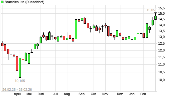 Mit dem Anstieg auf 15,35 EUR hat die Brambles-Aktie (ISIN AU000000BXB1) am 25.02.2026 ein neues All-Time-High erreicht und damit den Kurs vom 05.09.2025 eingestellt.Die ...weiterlesen