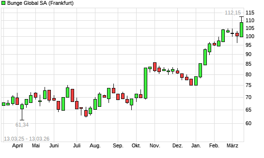Mit dem Anstieg auf 109,10 EUR hat die Bunge-Aktie (ISIN CH1300646267) am 12.03.2026 ein neues 3-Jahres-Hoch erreicht und damit den Kurs vom 14.09.2023 eingestellt.Die Bunge-Aktie ...weiterlesen
