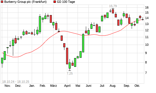 Mit dem Rücksetzer auf 13,72 EUR hat die Burberry Group-Aktie am 17.10.2025 die 100-Tage-Linie nach unten gekreuzt.Die Burberry Group-Aktie befindet sich seit dem 14.05.2025 im langfristigen ...weiterlesen