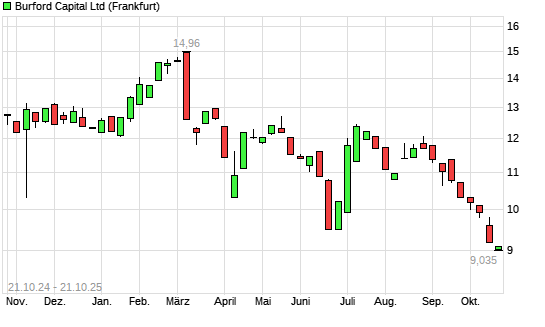 Mit dem Rücksetzer auf 9,03 EUR hat die Burford Capital Limited-Aktie (ISIN GG00BMGYLN96) am 20.10.2025 ein neues 12-Monats-Tief erreicht und damit den Kurs vom 17.10.2025 eingestellt.Die ...weiterlesen
