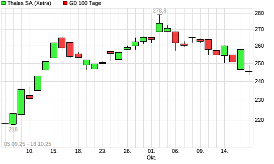 Mit dem Rücksetzer auf 245,00 EUR hat die Thales-Aktie am 17.10.2025 die 100-Tage-Linie nach unten gekreuzt.Die Thales-Aktie befindet sich seit dem 21.01.2025 im langfristigen Aufwärtstrend ...weiterlesen