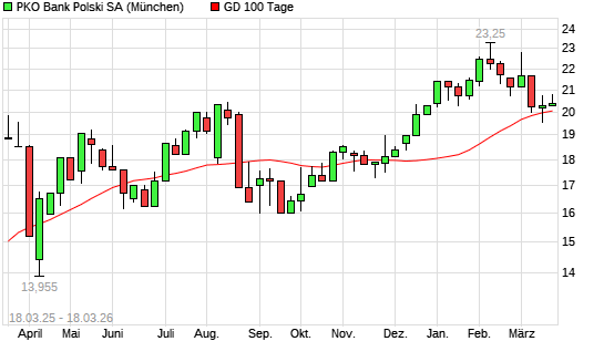 Mit dem Anstieg auf 20,84 EUR hat die PKO Bank Polski-Aktie am 17.03.2026 die 100-Tage-Linie nach oben gekreuzt.Die PKO Bank Polski-Aktie befindet sich seit dem 24.11.2025 im ...weiterlesen