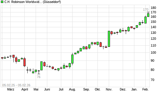 Mit dem Anstieg auf 168,00 EUR hat die C.H. Robinson Worldwide-Aktie (ISIN US12541W2098) am 04.02.2026 ein neues All-Time-High erreicht und damit den Kurs vom 03.02.2026 eingestellt.Die C.H. ...weiterlesen