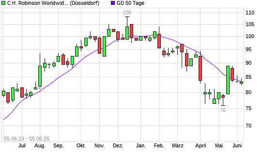 Mit dem Anstieg auf 83,50 EUR hat die C.H. Robinson Worldwide-Aktie am 04.06.2025 die 50-Tage-Linie nach oben gekreuzt.Die C.H. Robinson Worldwide-Aktie befindet sich seit dem 11.03.2025 im ...weiterlesen