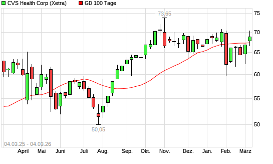 Mit dem Anstieg auf 69,26 EUR hat die CVS Health-Aktie am 03.03.2026 die 100-Tage-Linie nach oben gekreuzt.Die CVS Health-Aktie befindet sich seit dem 02.02.2026 im ...weiterlesen