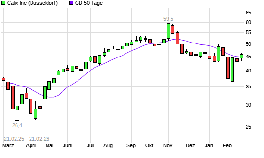 Mit dem Anstieg auf 46,60 EUR hat die Calix-Aktie am 20.02.2026 die 50-Tage-Linie nach oben gekreuzt.Die Calix-Aktie befindet sich seit dem 30.12.2025 im langfristigen Aufwärtstrend ...weiterlesen