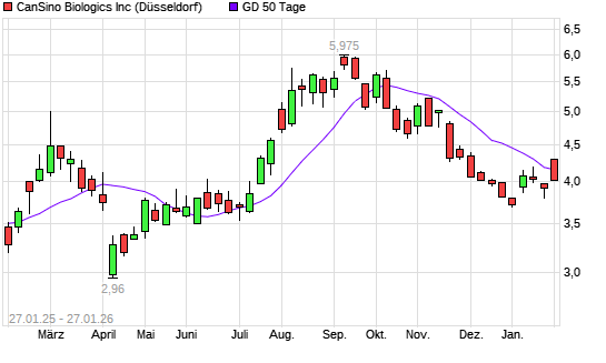 Mit dem Anstieg auf 4,24 EUR hat die CanSino Biologics-Aktie am 26.01.2026 die 50-Tage-Linie nach oben gekreuzt.Die CanSino Biologics-Aktie befindet sich seit dem 26.11.2025 ...weiterlesen