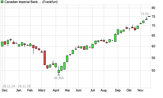Mit dem Anstieg auf 74,93 EUR hat die Canadian Imperial Bank of Comm-Aktie (ISIN CA1360691010) am 17.11.2025 ein neues All-Time-High erreicht und damit den Kurs vom 13.11.2025 eingestellt.Die ...weiterlesen