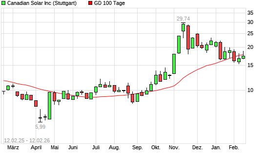 Mit dem Anstieg auf 18,32 EUR hat die Canadian Solar-Aktie am 11.02.2026 die 100-Tage-Linie nach oben gekreuzt.Die Canadian Solar-Aktie befindet sich seit dem 15.09.2025 im langfristigen Aufwärtstrend ...weiterlesen