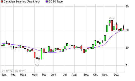 Mit dem Rücksetzer auf 20,10 EUR hat die Canadian Solar-Aktie am 25.12.2025 die 50-Tage-Linie nach unten gekreuzt.Die Canadian Solar-Aktie befindet sich seit dem 15.09.2025 im langfristigen ...weiterlesen