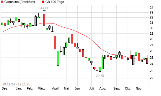 Mit dem Rücksetzer auf 24,20 EUR hat die Canon-Aktie am 18.11.2025 die 100-Tage-Linie nach unten gekreuzt.Die Canon-Aktie befindet sich seit dem 26.03.2025 im langfristigen Abwärtstrend ...weiterlesen