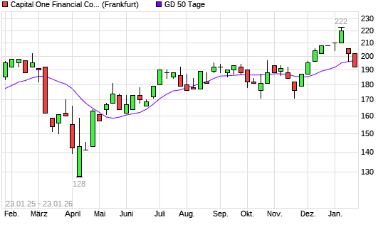 Mit dem Anstieg auf 200,00 EUR hat die Capital One Financial-Aktie am 22.01.2026 die 50-Tage-Linie nach oben gekreuzt.Die Capital One Financial-Aktie befindet sich seit dem 24.11.2025 im langfristigen ...weiterlesen