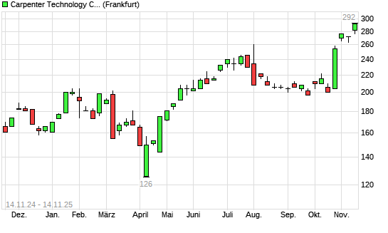 Mit dem Anstieg auf 292,00 EUR hat die Carpenter Technology-Aktie (ISIN US1442851036) am 13.11.2025 ein neues All-Time-High erreicht und damit den Kurs vom 10.11.2025 eingestellt.Die Carpenter ...weiterlesen