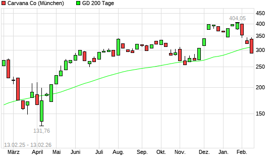 Mit dem Rücksetzer auf 289,10 EUR hat die Carvana Co.-Aktie am 12.02.2026 die 200-Tage-Linie nach unten gekreuzt.Die Carvana Co.-Aktie befand sich seit dem 10.11.2025 im ...weiterlesen