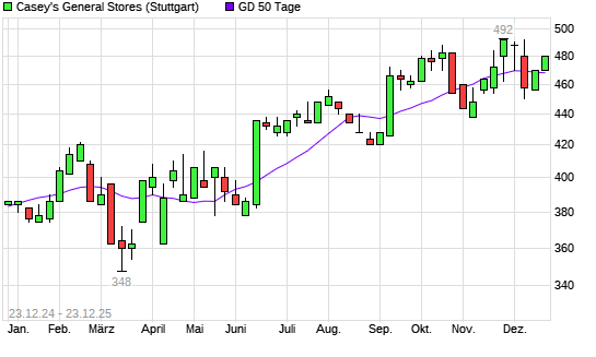 Mit dem Anstieg auf 472,00 EUR hat die Caseys General Stores-Aktie am 22.12.2025 die 50-Tage-Linie nach oben gekreuzt.Die Caseys General Stores-Aktie befindet sich seit dem 10.04.2025 im langfristigen ...weiterlesen