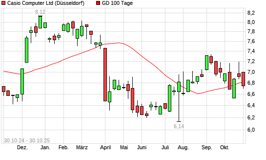 Mit dem Rücksetzer auf 6,76 EUR hat die Casio Computer-Aktie am 29.10.2025 die 100-Tage-Linie nach unten gekreuzt.Die Casio Computer-Aktie befindet sich seit dem 23.10.2025 im langfristigen ...weiterlesen