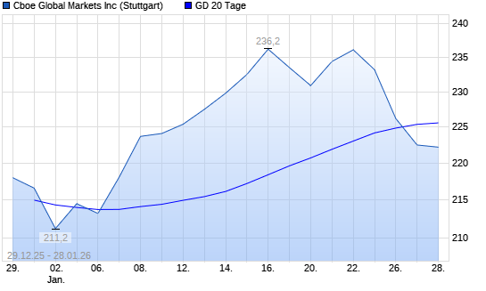 Mit dem Rücksetzer auf 223,90 EUR hat die Cboe Global Markets-Aktie am 27.01.2026 die 20-Tage-Linie nach unten gekreuzt.Die Cboe Global Markets-Aktie befindet sich seit dem 31.10.2025 im ...weiterlesen