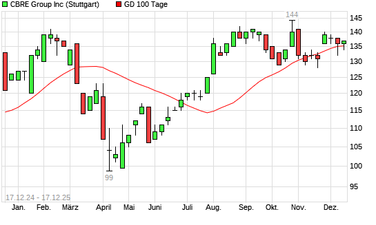 Mit dem Rücksetzer auf 133,00 EUR hat die Cbre Group-Aktie am 16.12.2025 die 100-Tage-Linie nach unten gekreuzt.Die Cbre Group-Aktie befindet sich seit dem 23.07.2025 im ...weiterlesen